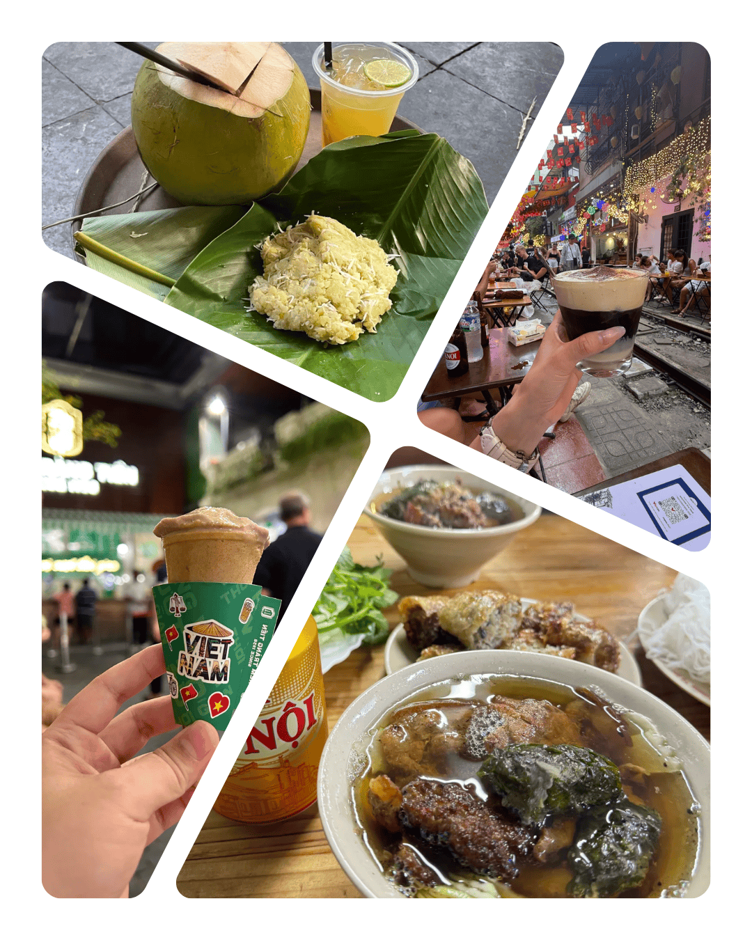 - 在地體驗:Trang Tien 冰淇淋、鐵道街咖啡、bánh bột lọc 傳統小吃